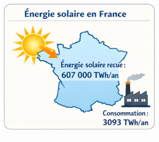 Exemple : Comparer l’énergie solaire reçue à la consommation française