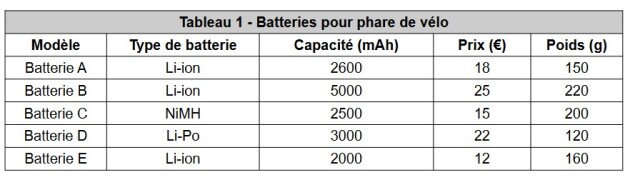 Exemple : Choisir une batterie pour un éclairage de vélo