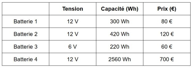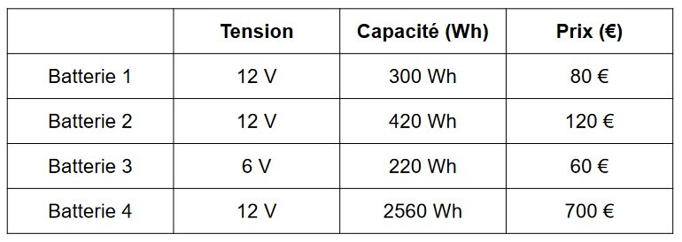 Choisir la batterie la moins chère qui répond à l'exigence en justifiant votre choix.