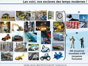 Selon les calculs de J.M. JANCOVICI, il faudrait 600 personnes à disposition de chaque français pour remplacer le service rendu par les machines, systèmes et autres objets technologiques.